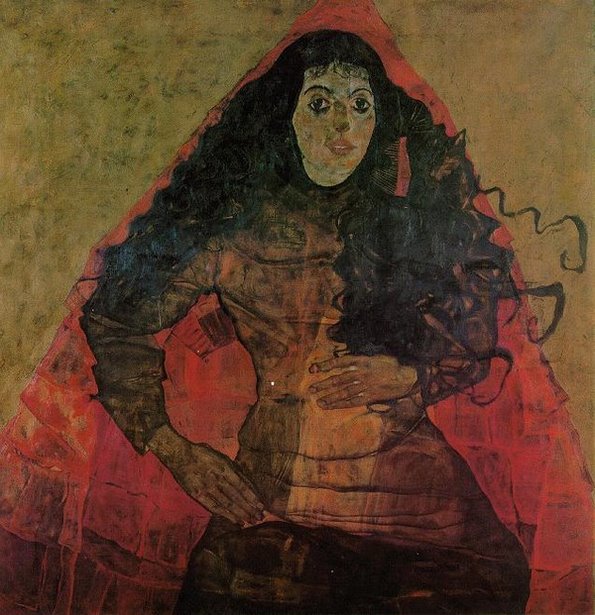 席勒描绘人体善用直线型简洁线条,来强调形体的骨感,表现人体上起伏的几何结构,塑造成修长、夸张和起伏感强烈的形体。在服饰上使用大小不一的几何形状概括,表达形体的节奏感。席勒的色彩都是非自然的,都是由画家的主观感受所决定的,使用的色彩极度概括,画面的黑白灰关系对比强烈又十分和谐。
