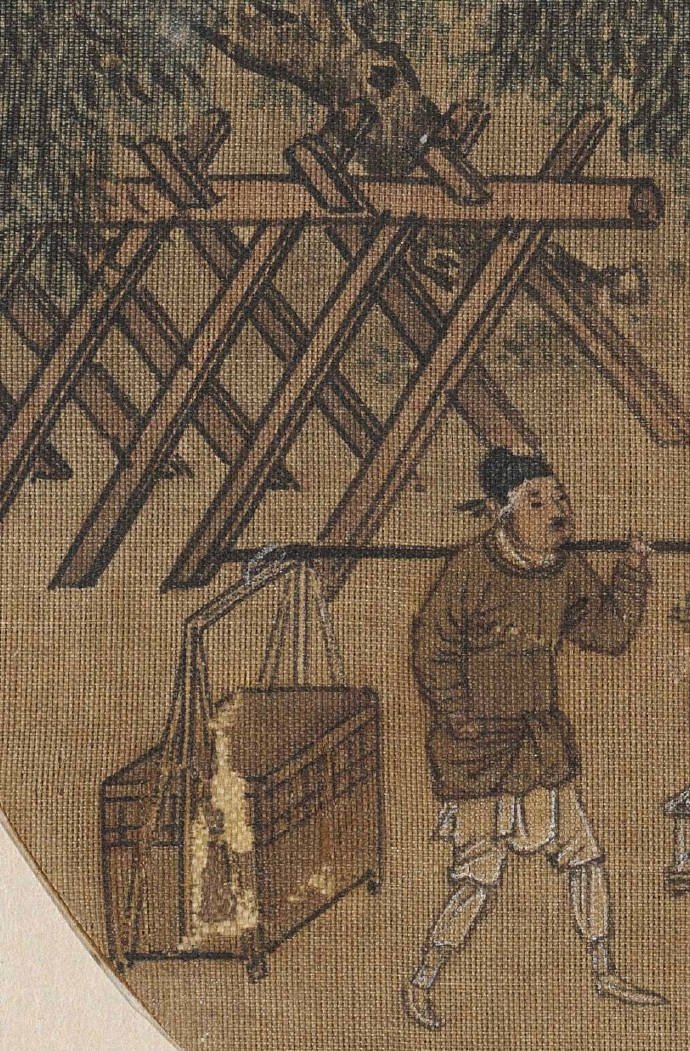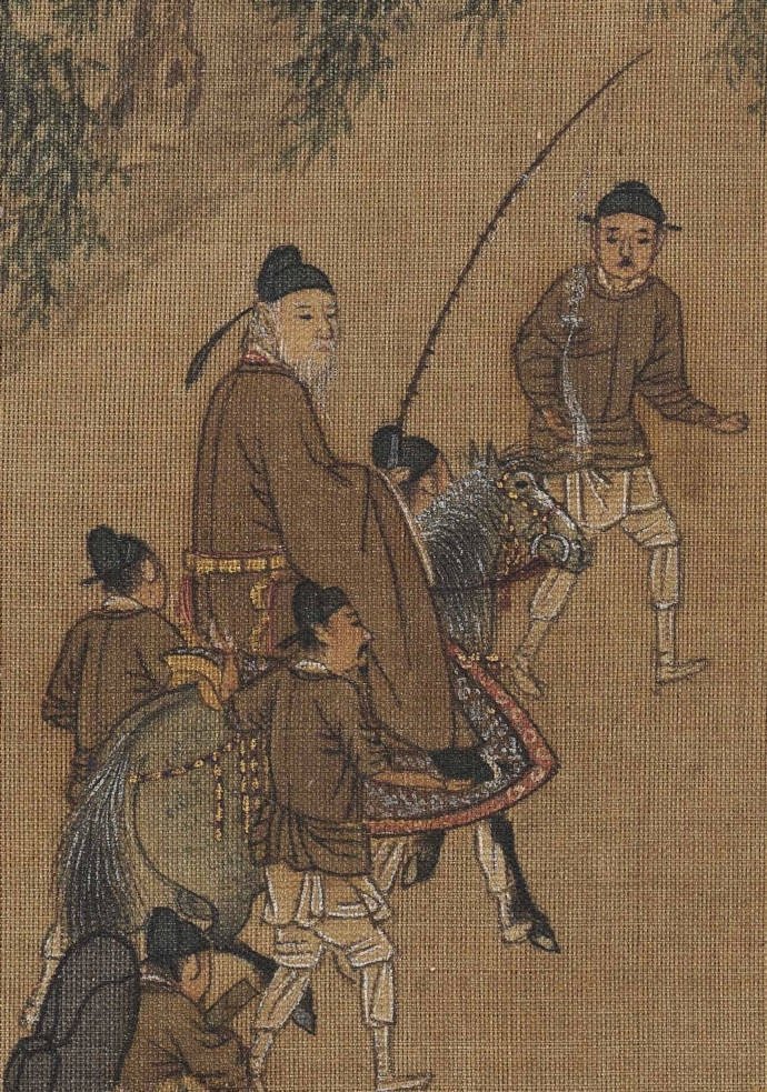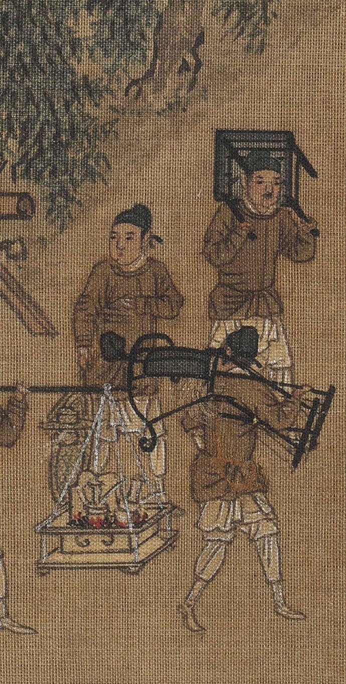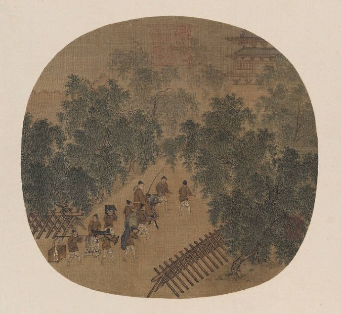 图中一行人城外春游归来,那时候没有高速免费一说,大家悠哉地穿过林荫向城门走去。骑在马上的老年官员应是主人,仆人们你挑着担,我牵着马,尽兴而归