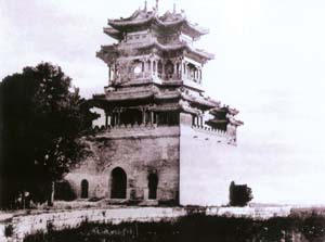 文昌阁。三层,楼顶大钟指向6点30分。据推测这张照片可能就是在此阁被毁当天或前一天拍摄的 资料图片