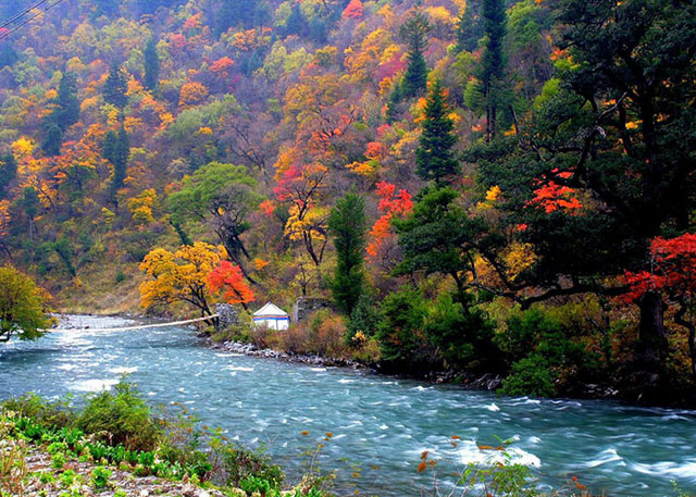每年10月中旬至11月上旬,秋日经霜,杂谷脑河两岸的枫、桦等树海被染成绮丽的红色、金黄色,红艳似火,美如云霞,广袤无际,远山雪峰晶莹,煞是迷人。