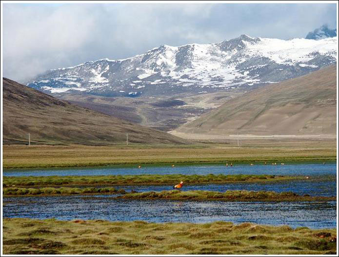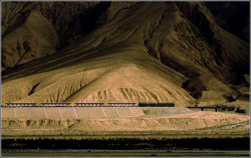 接着就向唐古拉山脉的更深处进发。虽然唐古拉山这一段是青藏铁路海拔最高的地方,但山脉并不像人们想象的那么险峻,可以说是很柔和。因为山上的植被覆盖的严密,没有破坏,有些地方从远看就像人的皮肤那么细腻,有种童话般的景致,但远处的雪山和寒风又会提醒这是在海拔5000米以上的高原。快到唐古拉山口时铁路会与109国道分开。唐古拉山口,公路海拔5231米,铁路海拔5072米,这里是世界铁路第一高站,也是我们列车在格拉段将要停靠的第七站。这里是青海西藏两省的天然分界线。这一带是一片冻土,泥土层的水分长年结冰,山口天气不稳定,即使夏天,公路也经常被大雪所封,冰雹、霜雪更是常见现象,此处空气含氧量只有海平面的六成,所以一般乘客路过唐古拉山口,会有明显的高山反应。