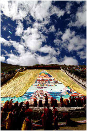 我们将要停靠的那曲行署所在地那曲镇是青藏公路和铁路的必经之地,也是西藏对外开放的旅游区之一,每年8月(藏历6月)举办的赛马节是藏北草原的盛会。夏日的那曲草原是一幅由蓝天、白云、彩虹、牛羊和绿草织就的锦缎画。如果有幸适逢其时,就可以领略藏北人的热情开朗和能歌善舞。有时间,还可以参观藏北名寺孝登寺。在车上你就可以明显感觉这边的草原比山北边好许多。唐古拉山的北边是高寒荒漠草原,这边就是高寒草甸区了,草长得更密、更长、水分也很多。山高了云就低,绿草覆盖的高原牧场与蔚蓝的天空在远处相接,从天际飘下来的云朵,漫成山坡上的羊群;羊群行得远了,又飘飞起来,成了头顶天空的白云。沿途也不再是无人区了,牧人和牲畜也渐渐增多,如果在公路上,时常还可以见到磕着长头朝圣的藏人。