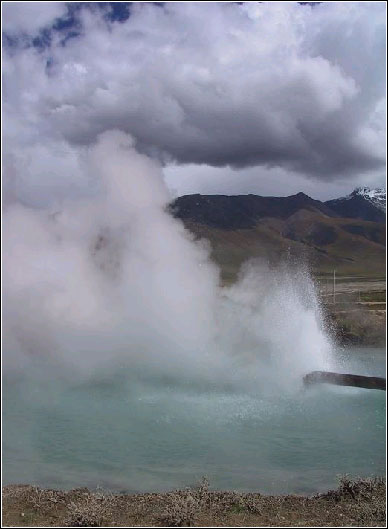 列车继续往南,经过羊八井镇,人烟更加稠密,进入了半农半牧区。这里是列车一路要停靠的第八站了。羊八井位于西藏拉萨市西北91.8公里的当雄县境内。羊八井镇,也是我国目前已探明的最大高温地热湿蒸汽田所在地,地热田面积17.1平方公里,温泉、热泉、沸泉、喷汽孔、热池、热爆炸穴星罗棋布。过去这里只是一块绿草如茵的牧场,从地下汩汩冒出的热水奔流不息、热汽日夜蒸腾。现在位于藏北羊井草原深处的羊八井地热电厂,已是我国目前最大的地热试验基地,也是当今世界唯一利用中温浅层热储资源进行工业性发电的电厂。你可以看到,在海拔4300米的羊八井盆地上,现已兴起一座全新的地热城,地热开发利用正向综合性方向发展。近10多年来,这里建成了蔬菜基地以及畜产品、硼砂加工厂等企业。目前,电厂已有8台3000千瓦机组,总装机2.5万千瓦。到去年底,共为西藏发电12亿千瓦小时,