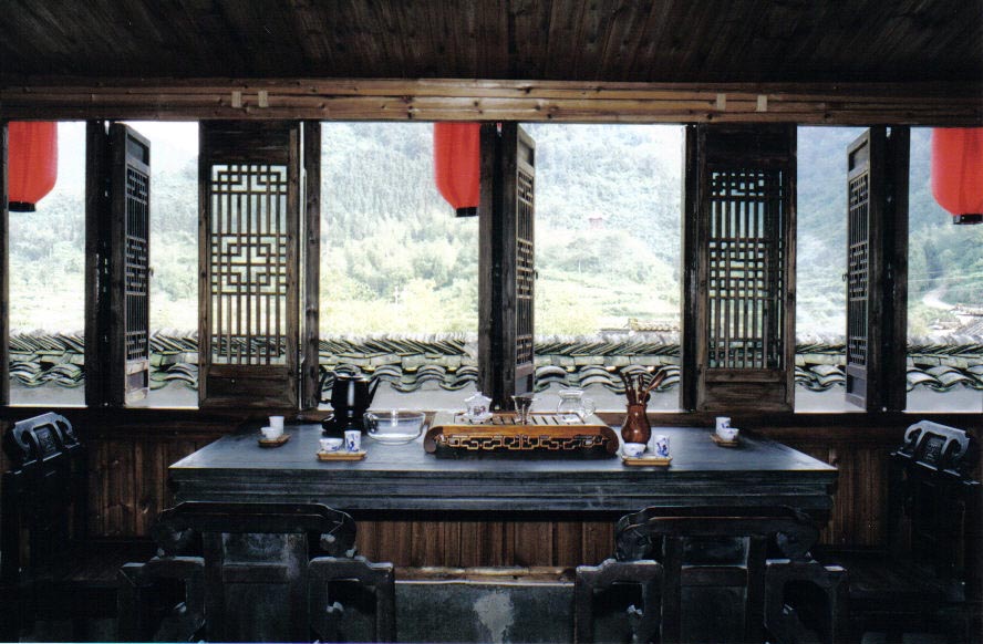 三层是珍茗阁茶楼。茶楼桌椅均为明清家具。视野广阔,站立“步步锦”窗前游目骋怀,足以极视听之;坐在明清茶桌前品茶赏月,惠风和畅,心旷神怡,娱信可乐也。周边奇山秀水的自然美景一览无余,尽收眼底