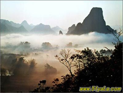 处处是高耸的峰丛,放眼望去重峦迭嶂,高低错落变化无穷,拟人拟物,裸露着奇特的形体r遍地可见深幽的洼地,俯首远眺隐约察觉村寨、田间和水池交织其间,不禁嗟汉这小小的一隅之谷犹如世外桃源,大有恍若隔世之感。这个奇妙的境地,磊磊多石,山岩嶙刚,崎岖突兀,间或夹杂坚韧虬典的林木盘根错节的榕树,显示出一种昏螟、空灵而粗犷的气势,令人十分骇异