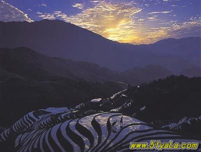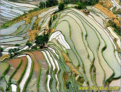 层层叠叠的梯田,天梯一样沿着山坡直上云天。梯田适合开在土质好、水源充足的向阳坡地,云南哀牢山地区属于海洋性亚热带气候,雨量充沛,那里的人们开垦了规模庞大、世界闻名的梯田。其中元阳的梯田比较有代表性,特别是云雾天气多的季节,山坡上大片的梯田在云雾笼罩下,就像从人间登上天堂的天梯,非常壮观美丽。