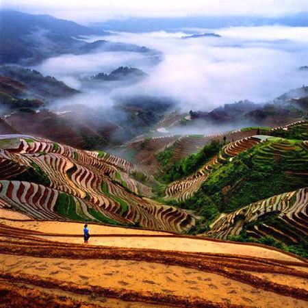 梯田的规模磅礴壮观、气势恢宏,线条行云流水、潇洒流畅,为天下梯田所望尘莫及;虽说南国山区处处有梯田,可是像龙脊梯田这样大规模的集中实属罕见。从流水湍急的河谷,到白云缭绕的山巅,从万木葱茏的林边到石壁陡崖前,凡有泥土的地方,都开辟了梯田。垂直高度达五六里,横向伸延五六里,那起伏的、高耸入云的山,蜿蜓的如同一级级登上蓝天的天梯,像天与地之间一幅幅巨大的抽象画……每位看见这一景色的游客,心灵也都会被深深地震撼!这是一种难以言表的,一种被大自然的雄奇以及人的伟力所引起的震撼!