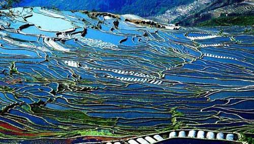 层层叠叠的梯田,天梯一样沿着山坡直上云天。梯田适合开在土质好、水源充足的向阳坡地,云南哀牢山地区属于海洋性亚热带气候,雨量充沛,那里的人们开垦了规模庞大、世界闻名的梯田。其中元阳的梯田比较有代表性,特别是云雾天气多的季节,山坡上大片的梯田在云雾笼罩下,就像从人间登上天堂的天梯,非常壮观美丽。