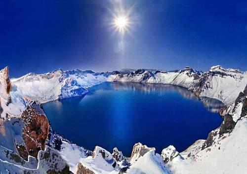长白山天池又称白头山天池,坐落在吉林省东南部,是中国和朝鲜的界湖,湖的北部在吉林省境内。长白山系复合式盾形休眠火山,为中国东北和欧亚大陆东部最高峰,是松花江、鸭绿江、图们江之源。史料记载天池水“冬无冰,夏无萍”,夏无萍是真,冬无冰却不尽然,冬季冰层一般厚1.2米,且结冰期长达六、七个月。不过,天池内还有温泉多处,形成几条温泉带,长150米,宽30- 40米,水温常保持在42摄氏度,隆冬时节热气腾腾,冰消雪融,故有人又将天池叫温凉泊。