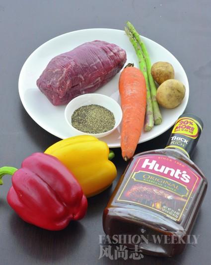 原料:牛里脊1块,胡萝卜,小土豆2个,芦笋2根,彩椒1/4个, 黑胡椒碎1茶匙, 烤肉汁1汤匙,盐3茶匙,油1汤匙