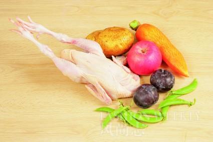 原材料:整鸡一只、苹果2个、李子4个、胡萝卜2根、土豆2个、甜豆150克