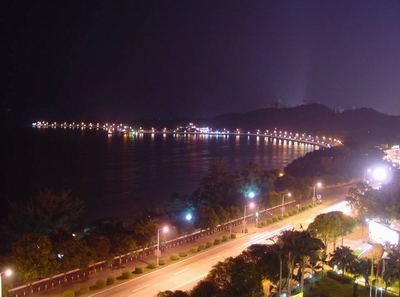 珠海的“情侣路”很长,车未入珠海市区,沿海的路就可以算是情侣路了——情人拍拖谈情的路,当然是越长越好。夜色朦胧,温馨细语,漫步在夜色下的情侣路上,听着“执子之手,与子偕老”的诺言,夫复何求?