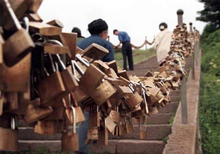 据说,只要将锁锁上之后,把钥匙决绝的掷入旁边的万丈深渊,便可“情定终身,永不分离”。有趣的是,许多同心锁原本没有钥匙眼,这表示一旦订情,就无退路。当然,这只是一种美好的心愿,一把小铜锁可绝对没有锁住一份因缘的能耐。可是,面对爱情,我们都有着美好的憧憬,峨眉山的同心锁,便能见证这一份深情与忠贞。
