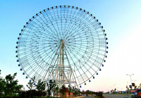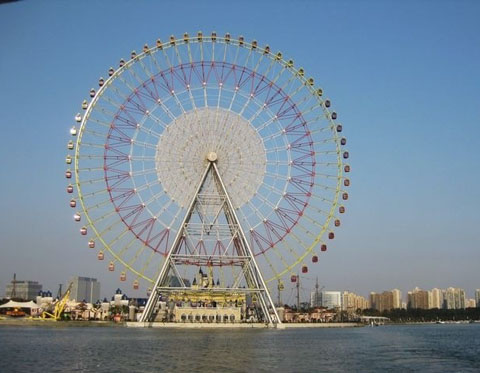 苏州金鸡湖摩天轮,高120米,是目前世界最大的水上摩天轮。它拥有瑞士进口的60个吊舱,可同时容纳360人观光,从摩天轮上俯瞰园区,将会呈现别样风情。