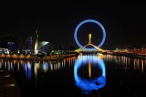 天津之眼,即天津永乐桥摩天轮,是世界上唯一建在桥上的摩天轮。摩天轮直径为110米,轮外装挂64个360度透明座舱,每个座舱可乘坐8个人,可同时供512个人观光。摩天轮旋转一周所需时间为30分钟,到达最高处时,周边景色一览无余,甚至能看到方圆40公里以内的景致,成为名副其实的“天津之眼”。