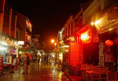 一条小河,两侧古老的建筑,大红灯笼、一轮明月、四方的游客和各种情调的酒吧,这就是古城晚上最热闹的地方———酒吧一条街。浓烈的古城氛围混合着时尚现代的风潮几乎刺激着每一位游客的感官神经,置身其中您开始晕眩,开始迷恋,一切美好的事情就此发生了……酒吧里丝竹婉转缔造的情调,迷离得让人晕眩的灯光,暗红而暧昧的鸡尾酒……那仅仅是浪漫的背景而已。男男女女的眼神闪烁,魅惑而难以解释的微笑,一个动作,一场对话,空气中弥漫着的除了暧昧还是暧昧,这也不过是一场绝美艳遇的开始……