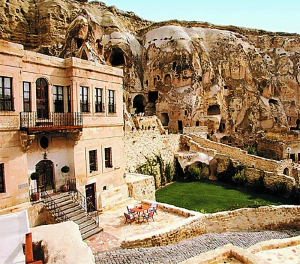 土耳其卡巴多基亚悬崖绝壁,2000多年前,就有部族避乱隐居于此,利用天然熔岩洞改造成为隐居者理想的住所。如今,这里已被改造为当地著名的“洞穴旅馆”,岩穴组成许多独立房间。这个山洞的主要成分是火山岩,特性是冬暖夏凉,酒店内长年维持17~20度的舒适温度,连空调都不用装。酒店结构由全人手刻凿而成,每间房间各不相同,每一条石缝都风格独特。