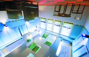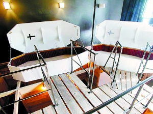 每个棺材床都能合上盖子,真的模仿吸血鬼那般入睡。如果容易失眠的人不想睡这些哥特式的床,或许在棺材床下面迷宫般的格子里能找到一个没那么惊悚的床入住。