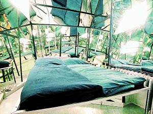 房客一打开门,势必会被高挂在天花板上的床吓到。房间里的床及桌椅都倒挂在天花板上,地板光溜溜的一片,就如整个房间倒立似的。
