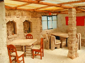 在南美洲玻利维亚西部一望无际的盐田里,有着世界上独一无二的、全部用盐巴建成的旅馆。在这个奇特的盐巴旅馆里,不但四周的墙壁,就连屋顶、床铺、桌椅及地板等,也都是用盐巴做成的。盐巴旅馆里面设有房间、餐厅、酒吧和舞厅。但旅客不可以用舌头舔墙,因为该旅馆连墙砖都用盐做的。