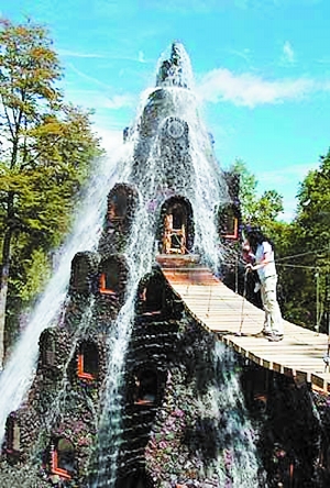 位于智利的魔术山旅馆,房间就在一个瀑布下面,旅客借由一个吊桥进出,好像住在水帘洞一样。周边环境是密林,老鹰在空中飞过,豹子在林中飞奔,在吊桥上漫步异常亲近自然。13个房间每个都有独立洗浴间。此外,还有11间小屋,每间能容纳4~6人。
