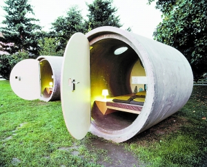 奥地利多瑙河畔,有三个排水管道被改造成名叫“Das park hotel”的迷你旅馆,每个排水管道重10吨直径都达6.5英尺,空间极其狭小,整间房子只够放下行李和一个电源。但里面有少量家具满足基本需要,一盏灯,一个床垫,有几个睡袋,和一扇可以上锁的门。