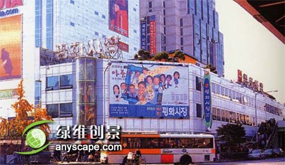 韩国汉城市明洞商业街,长约1.5公里,面积0.44km2,常住人口5千人,1天的流动人口超过200万,每年400万人以上的外国观光客来此。明洞商业街很好地保存着中国大使馆、明洞圣堂等韩国文物级建筑物,上世纪1980以后的一段时间里,热望韩国民主化的示威队把宗教设施明洞圣堂当全集会处,整天与警察对峙,满是催泪弹,感到商街存亡危机的商人们于1990年结成了[明洞商街繁荣会],宣布[和平之街]努力促使示威队和警察消失,在创造在和平的氛围中享受庆典的今日明洞具有深远意义之街。