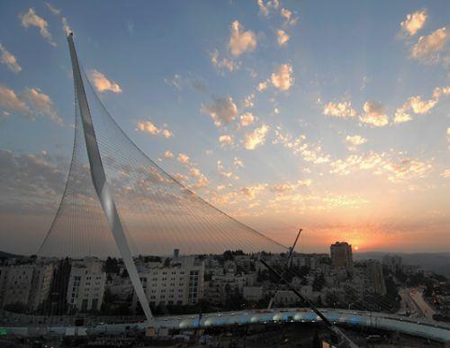 2008年6月25日,在以色列耶路撒冷举行科尔德斯大桥开幕式,如图正是科尔德斯大桥映衬在日落景色之中。这座交通大桥距离地面387英尺(118米),使用70根线缆将459英尺(约140米)的一段桥身悬浮起来。该桥能够承架轻重量列车运输系统,还有一个透明玻璃人行道用于步行。