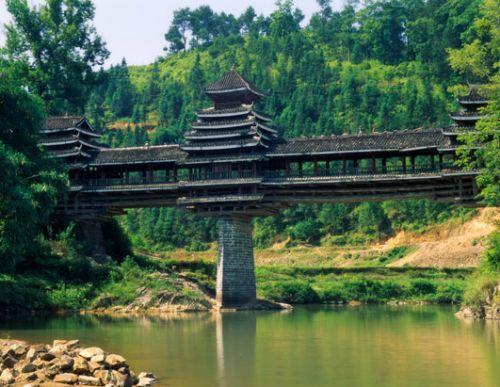 中国广西程阳风雨桥是最著名的屋顶结构桥,建造于1916年。主要是由木头和石材建造而成,风雨桥总长度为213英尺(约65米),横跨林溪河。