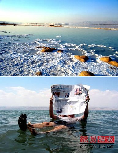 死海是位于以色列西海岸与约旦东海岸,沿着约旦大裂谷分布的咸水湖,18公里宽,67公里长,湖水由约旦河注入。最低处海平面以下420米,是地球水域的最低点,同时平均水深330米,也使其成为世界上最深的咸水湖。湖水含盐量为30%,为海水盐分的8.6倍,仅次于非洲吉布提的阿萨勒湖,居世界第二高。荒凉的环境鲜有生物,船只也无法在死海航行。