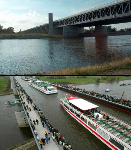 这座长度达918米的可供船只在其上航行的跨河水道桥于1997年动工,历时6年完成,于2003年开始投入使用。它将东部的马格德堡附近的米特兰德运河与西部的易北——哈维尔运河跨越易北河连接了起来。既有行人行走其上,又有船只航行,构成了这座桥的奇妙景观。