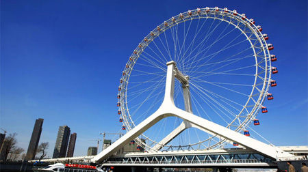 位于天津的永乐桥,兼具交通和观光功用,横跨海河,它的特别之处在于桥上矗立着一个名为“天津之眼”的高大雄伟的观光摩天轮,轮外装挂着共48个透明观光舱,每个观光舱可容纳8人,可供384人同时观光,游客乘坐摩天轮最高可达到120米的高空,尽享天“轮”之乐。
