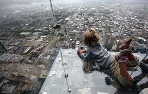 设计师们表示,这些平台的设计目的是为了让游人感觉他们像浮在城市上空一样。站在平台上,你能从大楼西侧看到下面芝加哥市和美得惊人的街道全景以及芝加哥河。当然,那些敢于向下看的人才会有这样的体验。来自加州比斯普的游客玛格丽特·科姆普说:“感觉就像走在冰上,迈出第一步时你会想:‘我会掉下去吗?’”