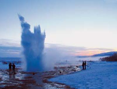 除了中国的间歇泉外,在冰岛首都雷克雅未克附近,还有一眼举世闻名的间歇泉―“盖策”泉。这个泉在间歇时是一个直径20米、被热水灌得满满的圆池,热水缓缓流出。不久,池口清水翻滚暴怒,池下传出类似开锅时的呼噜声,随之有一条水柱冲天而起,在蔚蓝色的天幕上飘洒着滚热的细雨,这条水柱最高竟可达70米!