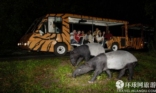 园区规划了两种游园方式,游览专车行径路线3.2公里,大约45分钟,沿途可看到凶猛的大型动物,如花豹、野牛、羚羊以及懒猴、眼镜猴等。如果看不过瘾,园区另外规划了渔猫小径、花豹小径和森林小径共2.8公里的步道,可慢慢探访夜色笼罩下的丛林景象。