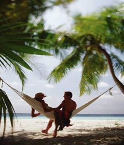 降落后是一座简易的浮板码头,正当情人们茫然失措时,一艘快艇从身后驶来,载着客人驶往沙岛另一侧的海滩屋——这才是属于情人的秘境。事实上,多尼岛小的有些可怕,它大概只有不足一平方公里,即使缓缓步行,绕岛一周也不过用时十分钟,触目所见,除了白沙椰树就是茫茫大海。这样枯燥的一座小岛,何以令世界各地的情人们心向往之呢?