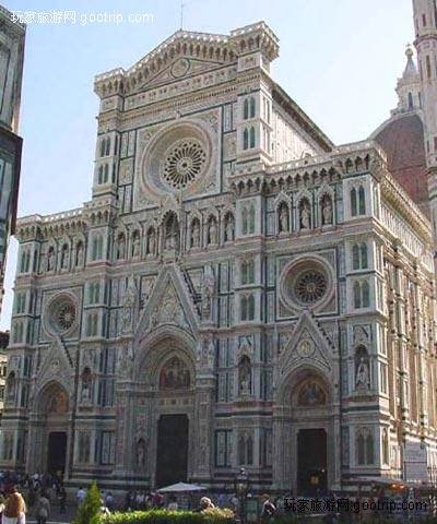虽然人们更普遍地把它称为“主教堂”(Duomo),但佛罗伦萨大教堂的正式名字是圣母百花大教堂。其中的花(FIORE)指的就是佛罗伦萨的象征之花——百合。为了与当时比萨和锡耶纳富丽堂皇的新教堂相抗衡,阿诺尔福?迪?坎比奥(Arnolfo di Cambio)1294年设计了这座大教堂,毫无疑问,它华丽极了。文艺复兴建筑大师布鲁内莱斯基(Brunelleschi)设计并监督筑造了它著名的圆顶。