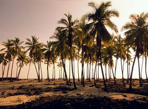 夏威夷在夏威夷凯卢阿的科纳海滨,椰林成行,它们细长躯干的分支处总是垂悬着几只硕大沉重的椰果。
