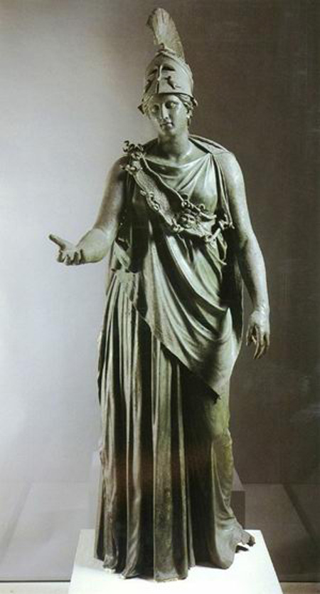 雅典娜为雅典城的守护神,也是代表智慧的女神。原作为巴底农神庙大殿的主像,全身高达13米,用银白色大理石雕成,局部镶嵌着象牙与黄金,可惜已在拜占庭帝国时代被毁坏。这里介绍的是大理石小型摹制品。在这件女神雕像中,她头戴战盔,身着希腊式连衣长裙,护胸和甲胄上装饰有蛇形饰边和人头像;她裸露双臂,透过薄衣裙可隐见丰艳健美而有力量的身体;衣裙褶纹和饰物造成横竖线条的疏密变化美;她的手势动作可能是执长矛和托物,整个形象富有女性的温柔和充满生命,更多的是人性,绝少神性,这表明希腊化时期艺术已走向世俗化。