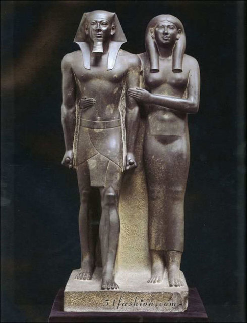 高约142 厘米,约创作于公元前2600年,现收藏于美国波士顿博物馆。这是埃及古王国第四王朝时期的一尊双人立像,也是当时帝王立像中最典型的代表。雕像刻划的是埃及古王国第四王朝第五个法老门考拉和他的王妃。