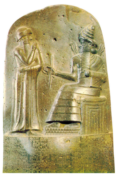 约公元前1792年-1750年,高约71厘米,石碑全长213厘米,现收藏于巴黎卢浮宫。“汉谟拉比法典”是世界上所发现的最早的成文的法律条文,是人们研究古代巴比伦经济制度与社会法治制度的极其重要的文物;同时,它还是古代巴比伦艺术的代表,尤其因为古巴比伦王国流传下来的艺术品十分罕见,所以这个石碑就更加显得格外珍贵,石碑的雕刻比较精细,表面高度磨光。石碑上刻满了楔形文字,全文280条,对刑事、民事、贸易、婚姻、继承、审判制度等都作了详细的规定。法典的上部是巴比伦人的太阳神沙玛什向汉谟拉比国王授予法典的浮雕。太阳神形体高大,胡须编成整齐的须辫,头戴螺旋型宝冠,右肩袒露,身披长袍,正襟危坐,正在授予汉谟拉比象征权利的魔标和魔环;汉谟拉比头戴传统的王冠,神情肃穆,举手宣誓。太阳神的宝座很象古巴比伦的塔寺,表示上面所坐的是最高的神。