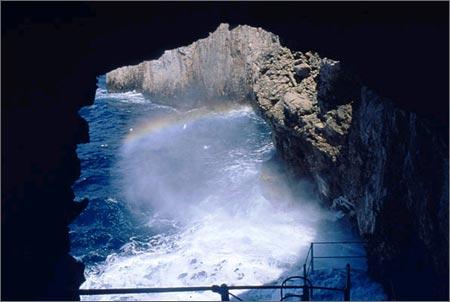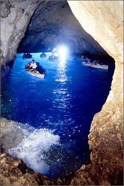 所谓蓝洞,是一个位于海面上的天然洞穴。入口仅1米,长54米、高15米、水深22米的洞内,会因太阳光而反射出一种不可思议的蓝色光。这里堪称全岛最拥挤之地,排队等入场的小艇全日不绝。在内的时间只得5分钟,但这种前所未见,又只此一家的蓝光,令各国游客不禁大声赞叹。