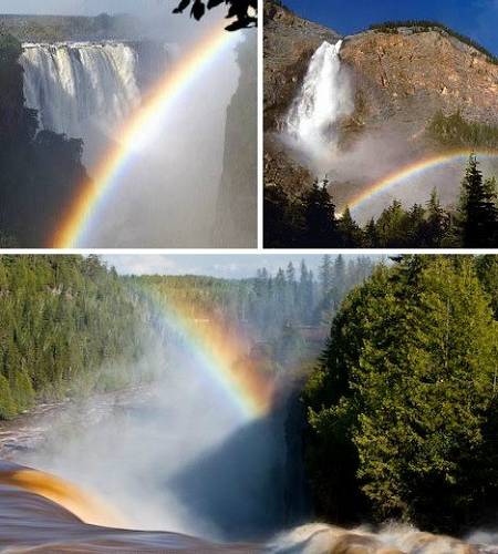 持续不断的瀑布往往会在空气中形成水雾,因此不管天气阴晴,大气的饱和度总是能够保持稳定。这种情况就使得瀑布附近总是伴有彩虹现象。这些图片显示的都是世界上最著名的瀑布所形成的壮观彩虹。各种各样的瀑布彩虹其实都是“喷雾彩虹”。在阳光灿烂的日子里,如果风力吹起海浪或湖波,在水面上空形成一层喷雾层,空气变得饱和,也可形成海面或湖面彩虹。