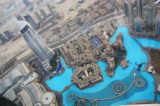 从哈利法塔124层高空俯瞰世界最大音乐喷泉