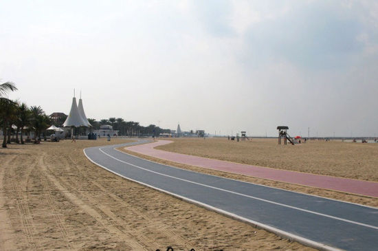 迪拜有几个风景漂亮的海滩,说最美丽的,同时也是不收费的一个在卓美拉清真寺附近,就叫Open Beach(开放海滩)。于是我慕名而来,顺便把卓美拉清真寺(Jumeirah Mosque)也看了。Open Beach被誉为迪拜最美丽的免费海滩,就在卓美拉清真寺走出来500米内的距离,其实感觉一般。其实靠近七星级帆船酒店的Umm Squeim Beach应该更漂亮一些,Open Beach的沙质虽软,但不白。Open Beach有专门慢跑用的跑道,这样鞋子就不会进沙。