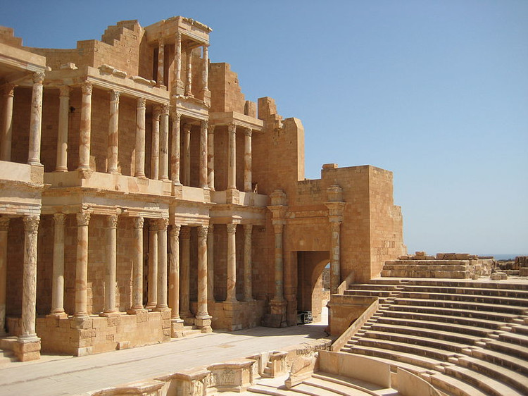 大莱波蒂斯(Leptis Magna),建于公元前2世纪。这座古城的遗址位于利比亚首都的黎波里以东约130公里处,被认为是“非洲地区保存最完好的,规模最宏伟”的古罗马帝国遗址。公元前1100年,腓尼基人( Phoenician)在这里建造了殖民定居点,后来这里成为迦太基帝国(Carthage)的领域。公元前146年第三次布匿战争后,落入罗马共和国手里,在台比留(Tiberius,前42-37,在位14-37年)担任罗马皇帝期间并入罗马帝国的阿非利加行省(Africa),此后很快成为地中海的主要贸易点之一。上图为大莱波蒂斯的剧场(theater)。