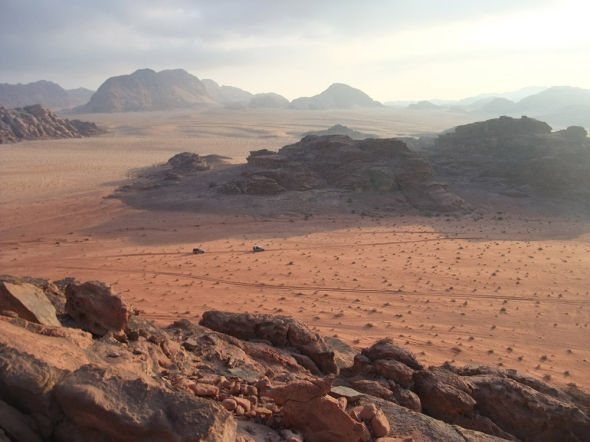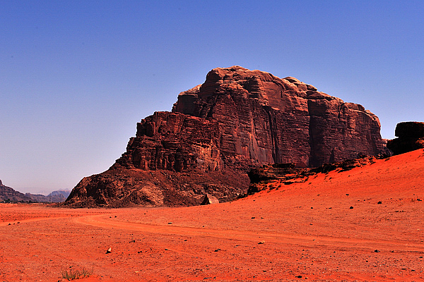 真正的瓦地伦远比电影镜头里的影像更辽阔。这里的沙漠不是撒哈拉那种明黄色的一望无尽,玫红色的瓦地伦沙漠里有山峦交映。所谓的山峦不是阳朔那种泼墨般起伏,也不是黄山那种险峻,瓦地伦的山是在沙漠的同色系中跳跃而出,突然间出现笔直硬朗的一排山崖,不可攀登。也有背风坡积累下的沙丘,在阳光下照耀出浅浅的一浪一浪,踏上一脚就陷进这酒红色里面,背后的脚印又被风吹起的沙砾蒙蔽不见。瓦地伦有着沙漠的广博含蓄,更有着山谷的野性和豪迈。