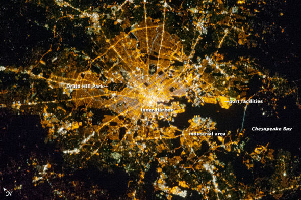巴尔的摩是美国大西洋沿岸重要的海港城市,位于切萨皮克湾顶端的西侧,离美国首都华盛顿仅60多公里,港区就在帕塔帕斯科河的出海口附近。上面这幅巴尔的摩夜景照片是国际空间站上的宇航员2012年10月16日拍下的。像美国的许多大都市区一样,巴尔的摩夜晚灯火最明亮的地方即建筑物密度最高的地方,也就是城市中心,包括旅游区和商业区。