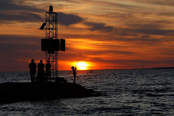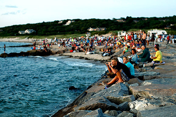 人们聚集在奇尔马克镇北部小渔村门纳穆莎(Menemsha)的海滩上,一边欣赏日出,一边享受着美味的炒蛤蜊和鳕鱼三明治。