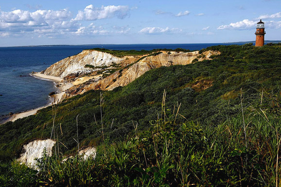 阿奎那(Aquinnah)的峭壁和灯塔。阿奎那岛居住着约600名居民,他们是印第安部落的万潘诺格(Wampanoag)人。
